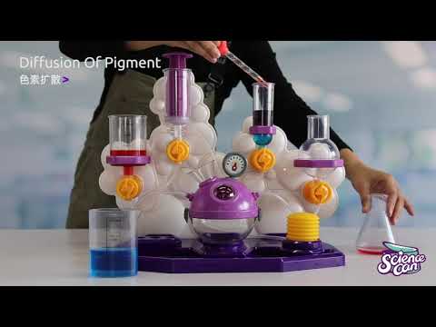 Setul include: recipient pentru masurare, 3 eprubete, pahar, betisor pentru amestecare, ochelari de protectie, furtunuri, recipient cu bicarbonat de sodiu, 3 recipiente cu pigmenti colorati, 2 baloane, 2 tablete efervescente, 2 carduri transparente, palnie, vas Petri, lingura, pipeta din plastic, recipient cu acid citric, recipient cu hidroxid de calciu, 3 benzi de testare a pH-ului, 10 carduri cu 20 experimente, manual, suruburi, piese consola pentru recipiente care trebuie asamblate de catre un adult.